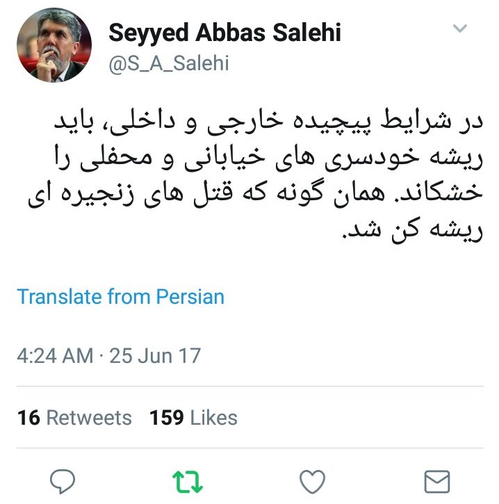 سیدعباس صالحی (معاون فرهنگی وزارت فرهنگ و ارشاد اسلامی) در صفحه شخصی خود در توییتر به اقدام برخی در توهین به رئیسجمهور واکنش نشان داد.