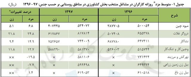 با توجه به متوسط مزد روزانه در استانهای کشور، بالاترین مزد روزانه برای مردان مربوط به "کارگر وجین کار و تنک کار" در استان گیلان با ۱۲۰ هزار و ۸۹۹ تومان و پایینترین مزد روزانه مربوط به "کارگر نهرکش و مرزبند" در استان خراسان جنوبی با ۳۰ هزار تومان است. بالاترین مزد روزانه برای زنان در بین استانهای کشور نیز مربوط به "کارگر وجین کار و تنک کار" در استان گیلان با ۱۰۲ هزار و ۶۲۵ تومان و پایینترین مزد روزانه مربوط به " کارگر وجین کار و تنک کار" در استان خراسان رضوی با ۲۷ هزار و ۹۰۷ تومان بوده است.