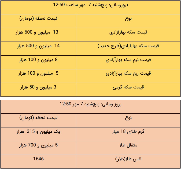 قیمت طلا و سکه، امروز ۷ مهر ۱۴۰۱