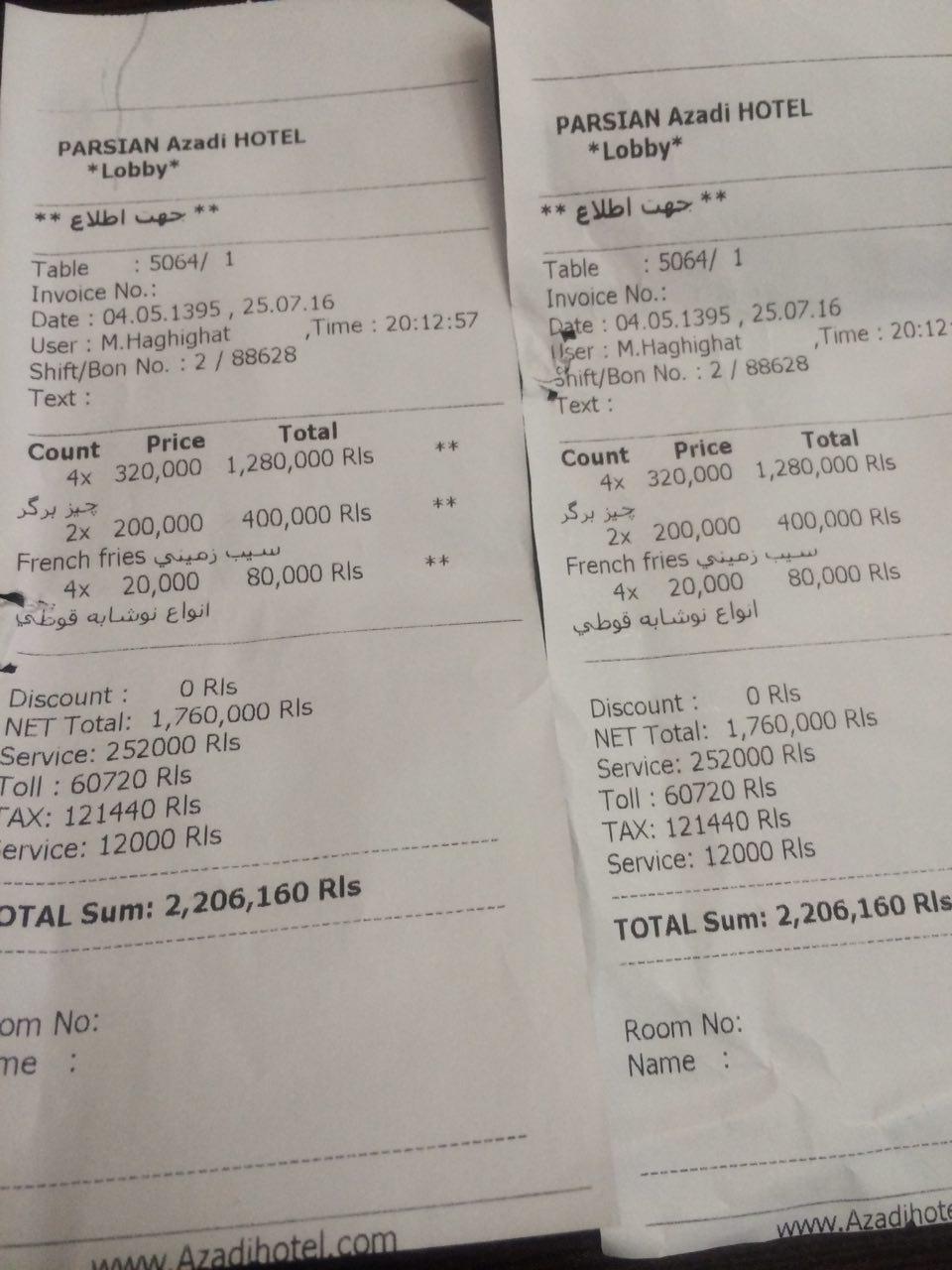 فاکتور دو میلیون و دویست هزار ریالی هتل وابسته به بنیاد مستضعفان برای چهار ساندویج چیزبرگر!