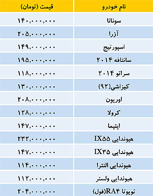قیمت خودوهای میلیونی در بازار به شرح جدول زیر می باشد: