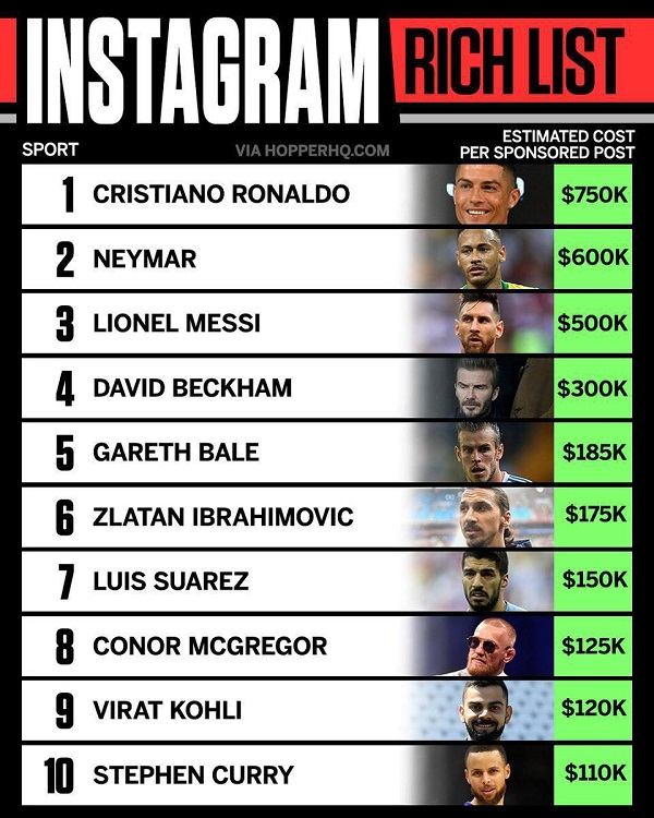 درآمد ورزشکاران بزرگ، برای گذاشتن یک پست در اینستاگرام چقدر است؟
