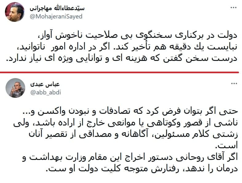 مهاجرانی و عبدی خواستار برکناری مقام وزارت بهداشت که منتقدان را «پفیوز» خوانده، شدند