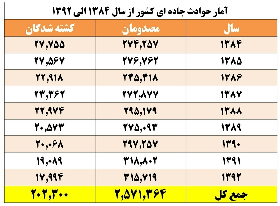 بر اساس آمار حوادث جاده ایی کشور از سال 1384 الی 1392حدود 202300 نفر در تصادفات رانندگی کشته و 2571364 نفر نیز مصدوم شده اند.