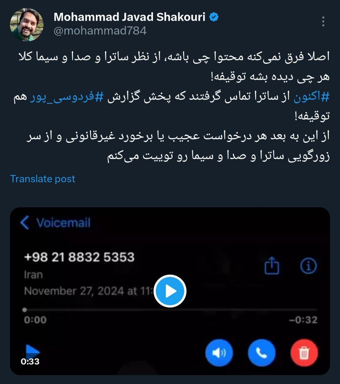 او نوشت: «اصلا فرق نمی کنه محتوا چی باشه، از نظر ساترا و صداوسیما کلا هر چی دیده بشه، توقیفه. اکنون از ساترا تماس گرفتند که پخش گزارش فردوسی پور هم توقیفه. از این به بعد هر درخواست عجیب یا برخورد غیرقانونی یا از سر زورگویی ساترا و صداوسیما رو توییت می کنم.»
