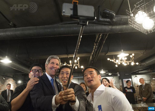خبرگزاری فرانسه تصویری از جان کری وزیر امور خارجه آمریکا را منتشر کرده است که در یک رستوران در سئول در حال سلفی گرفتن با مردم عادی است.
